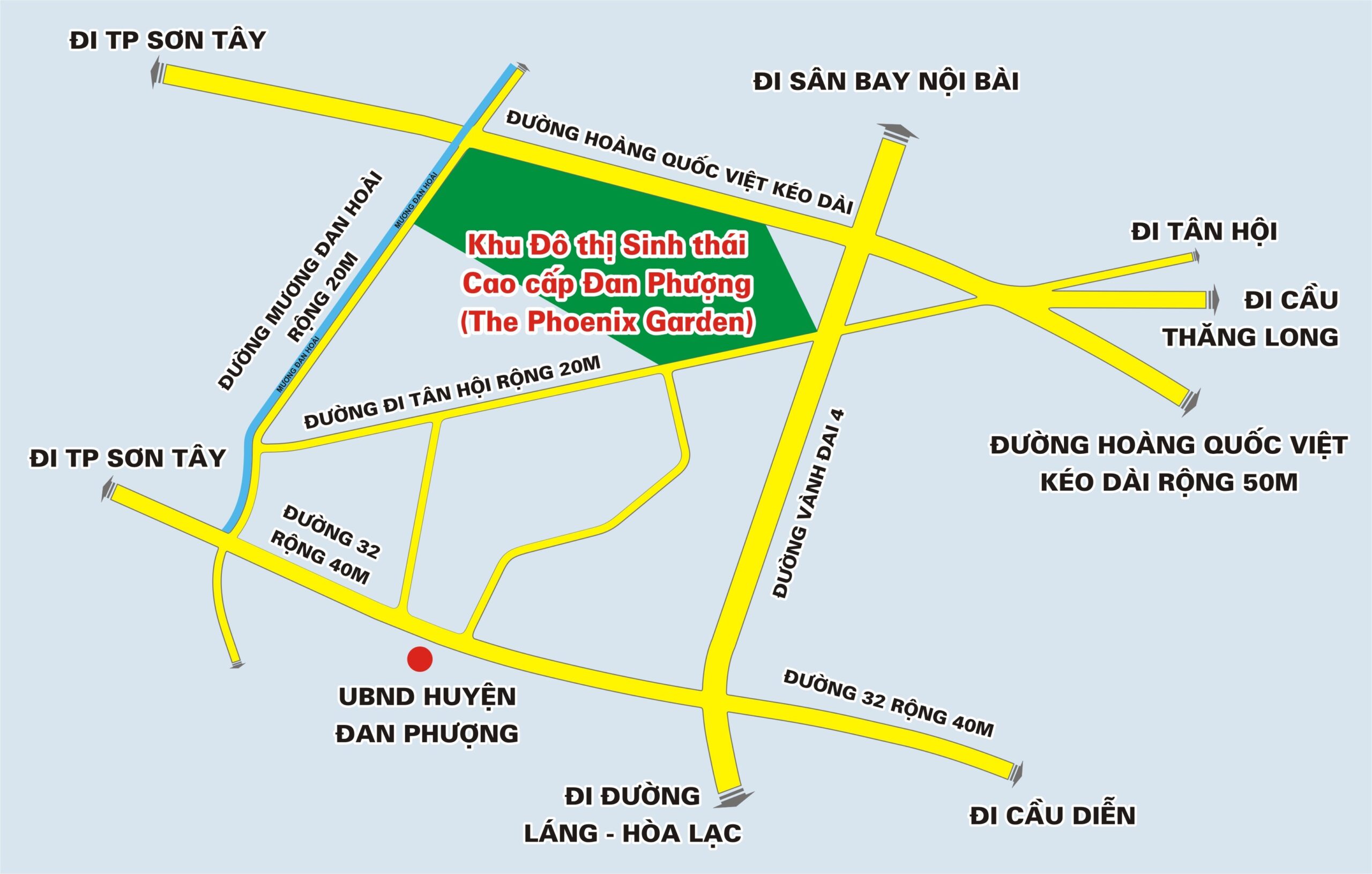 – Phía Tây giáp mương Đan Hoài, có tuyến đường rộng 20 m,